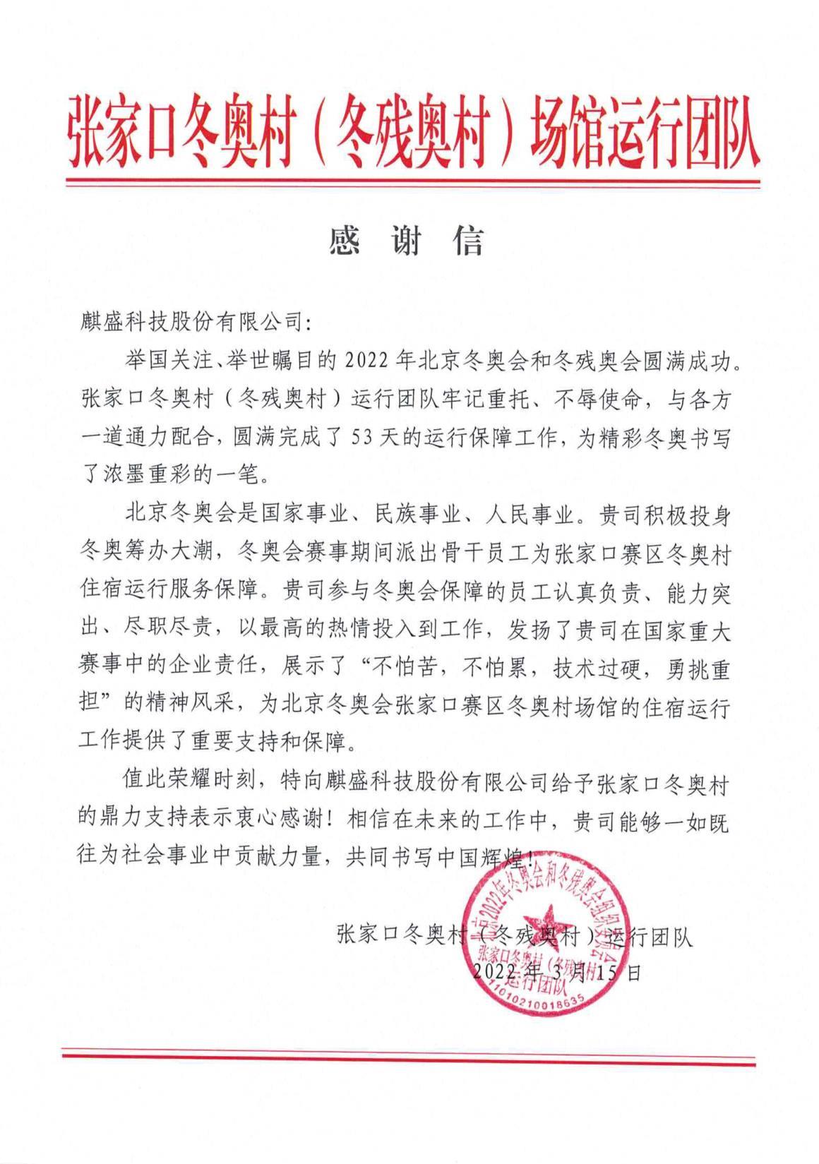 日前,麒盛科技收到了来自张家口冬奥村(冬残奥村)运行团队的一封感谢信——