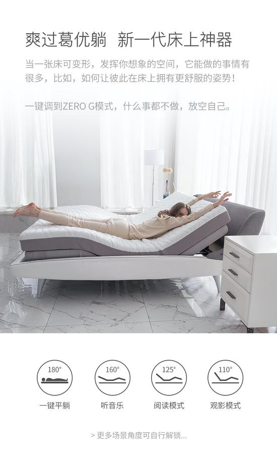 智能电动床的床头床尾可通过遥控器或手机app控制升降,组合出多种姿势匹配众多生活场景,一款“聪明”的床,能懂你所需。启动电动记忆模式,一键“葛优躺”找到自己设定的最佳姿势;在读书、刷手机模式下,麒盛科技智能床能调整至背靠125°度的最佳视角,让颈椎得到最有利的支撑;在观影模式下,床体背靠抬升110°度,腿部抬高20度,使用户在柔软舒适中放松追剧,享受属于自己的“私人影院”;在个性模式下,做个“小燕飞”,舒展身心缓解一天的脊椎腰椎疲劳;适当调整床头角度,使孕妇、老人等特殊人群起卧撑腰……