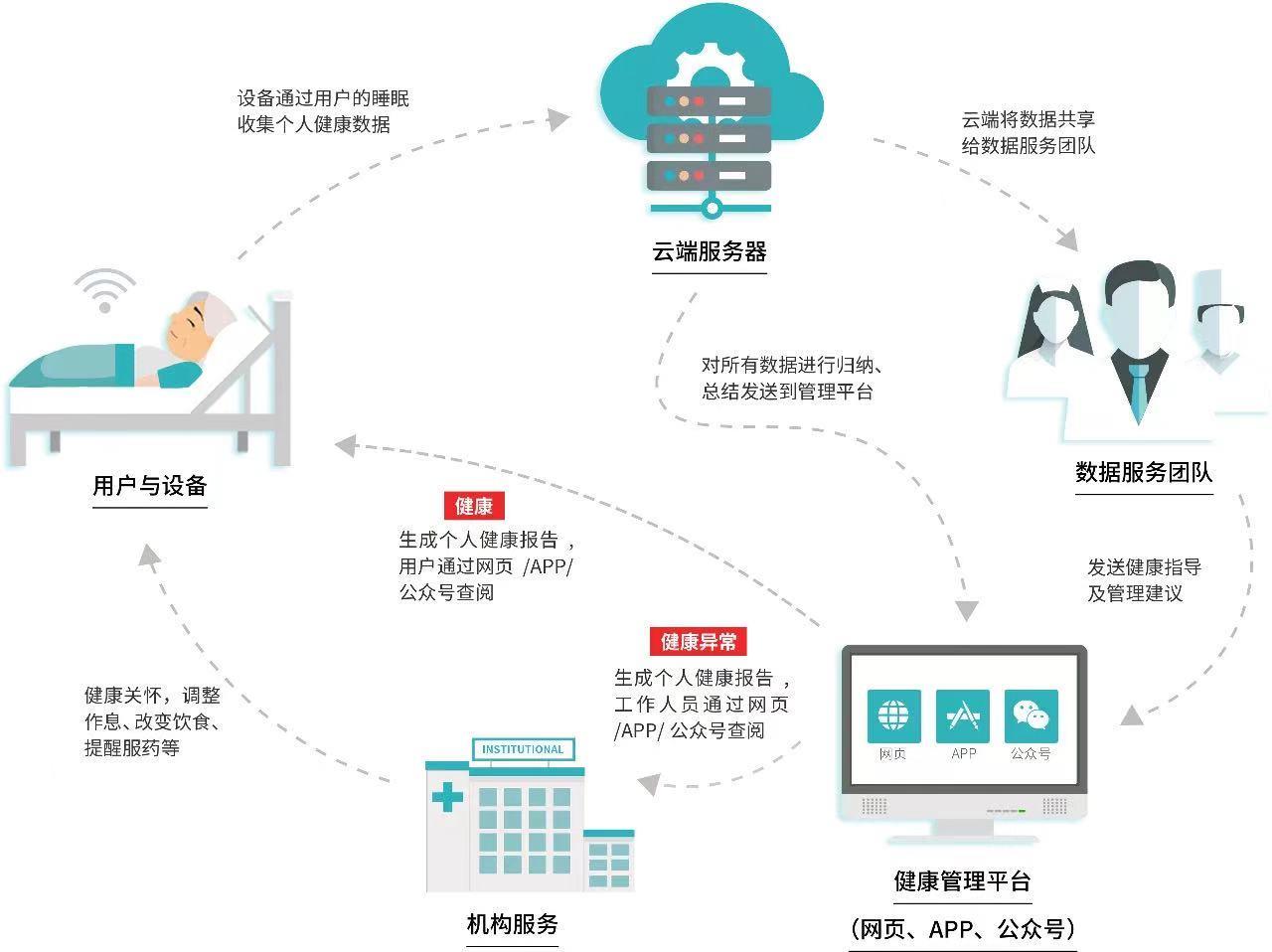 麒盛数据健康服务平台通过智能床,以非接触式传感器为载体,采集人体睡眠时的体征数据,同时健康管理团队结合用户提供的个人健康状况、过往病史等信息,依据健康科学理论,对用户数据进行深度处理、分析并归纳、总结其规律,为每一名用户建立属于自己的长期个人健康档案。