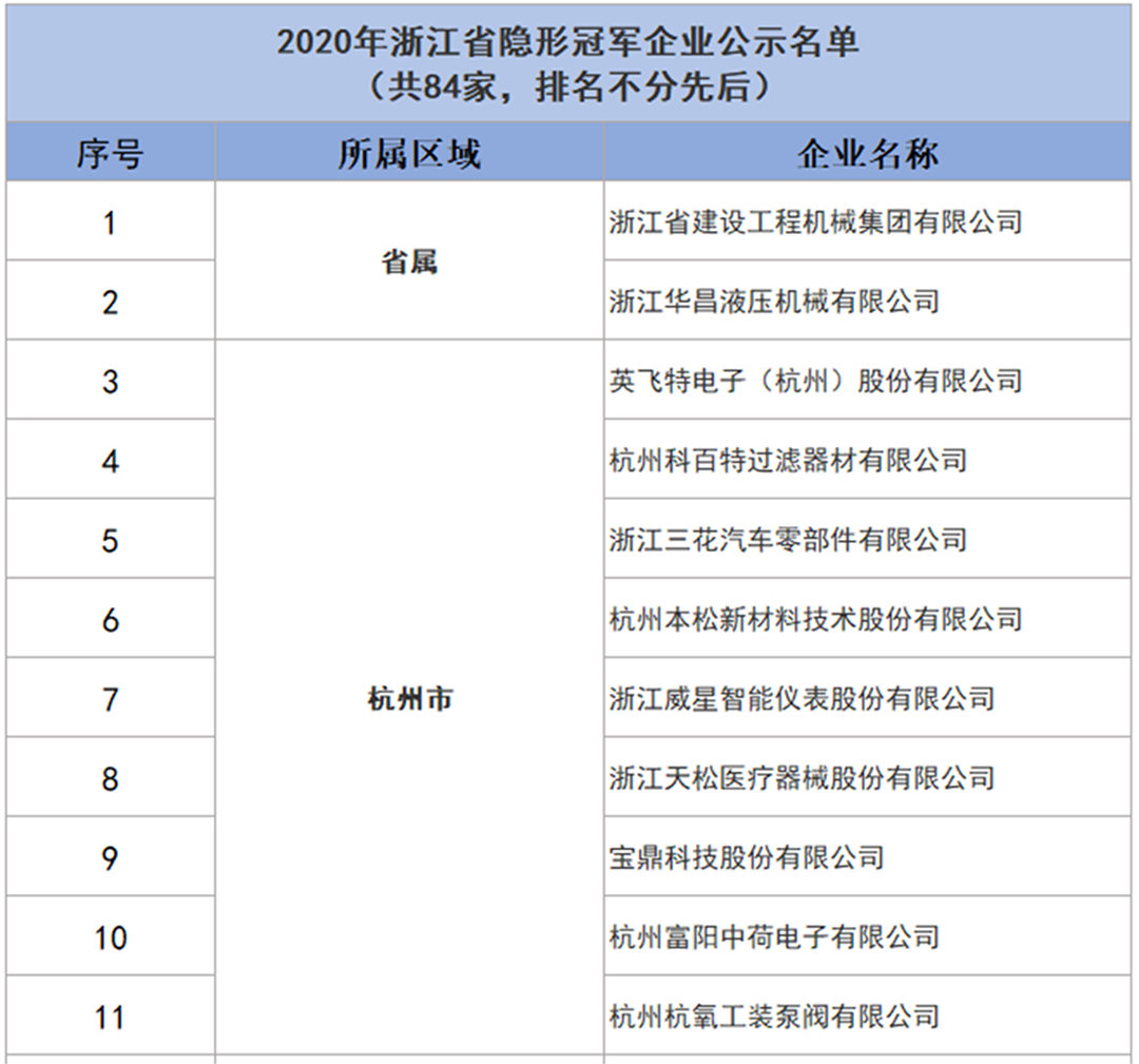为贯彻落实《浙江省人民政府办公厅关于开展“雏鹰行动”培育隐形冠军企业的实施意见》(浙政办发﹝2019﹞28号),根据省经信厅《关于组织2020年隐形冠军及培育企业申报工作的通知》要求,经企业自愿申报,各县市经信部门初审推荐,省经信厅组织形式审查和专家评审,经研究拟确定2020年浙江省隐形冠军企业名单,现予以公示。